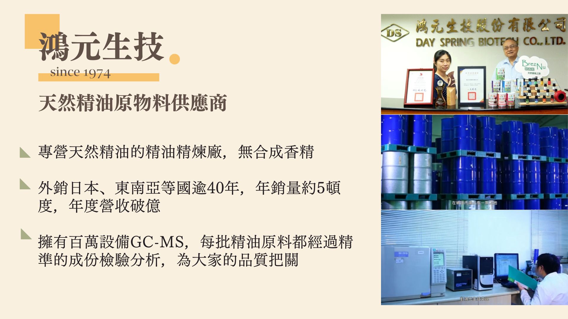 - **成立**:1974年,台灣唯一有50年歷史的精油精煉廠 - **產品**:無毒、無害的天然產品 - **認證**:ISO22000&HACCP、HALAL、KOSHER、ESG - **服務**:精油原物料買賣、客製化配方、... 閱讀更多